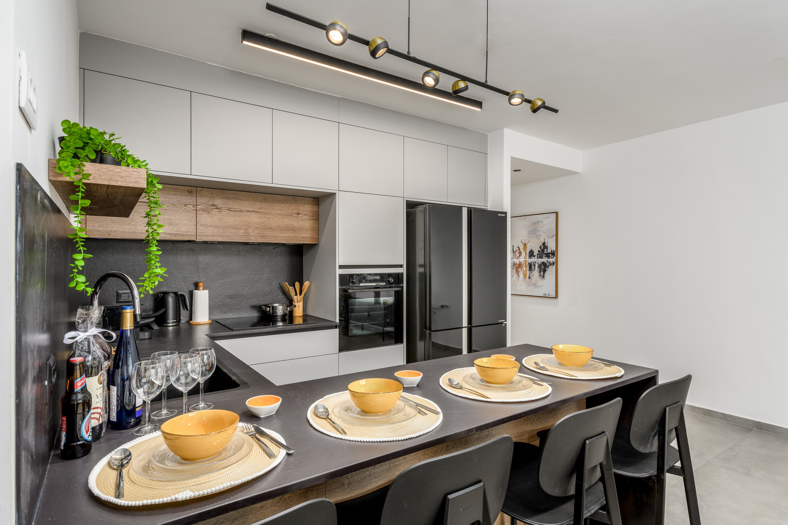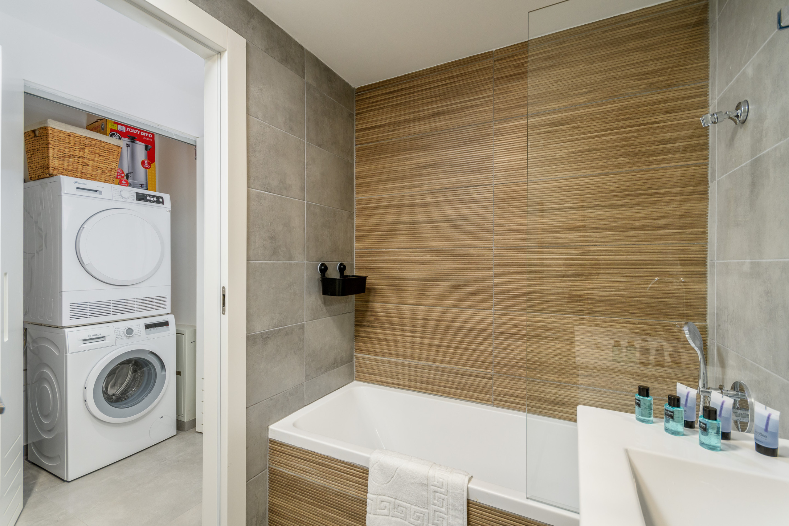 L'appartement dispose d'une cuisine de style américain moderne, entièrement équipée d'appareils essentiels, comprenant un réfrigérateur, un congélateur, un lave-vaisselle, un four, un micro-ondes, une machine à café et tous les ustensiles de cuisine nécessaires. Profitez du confort d'un lave-linge et d'un sèche-linge pendant votre séjour.