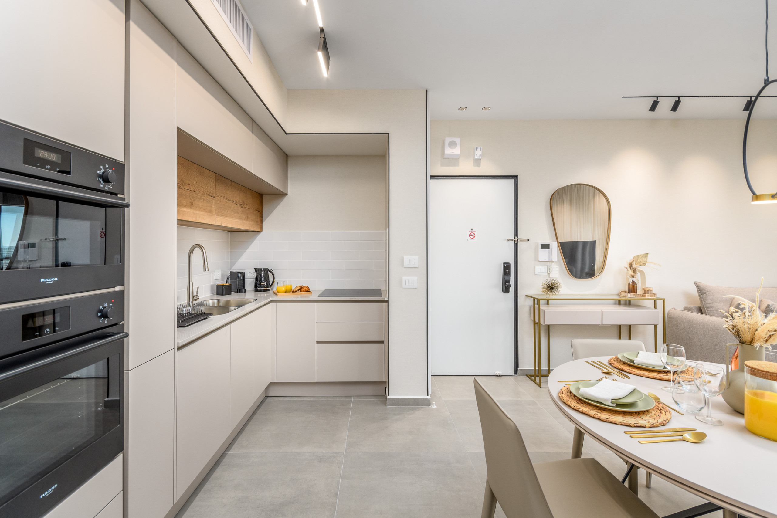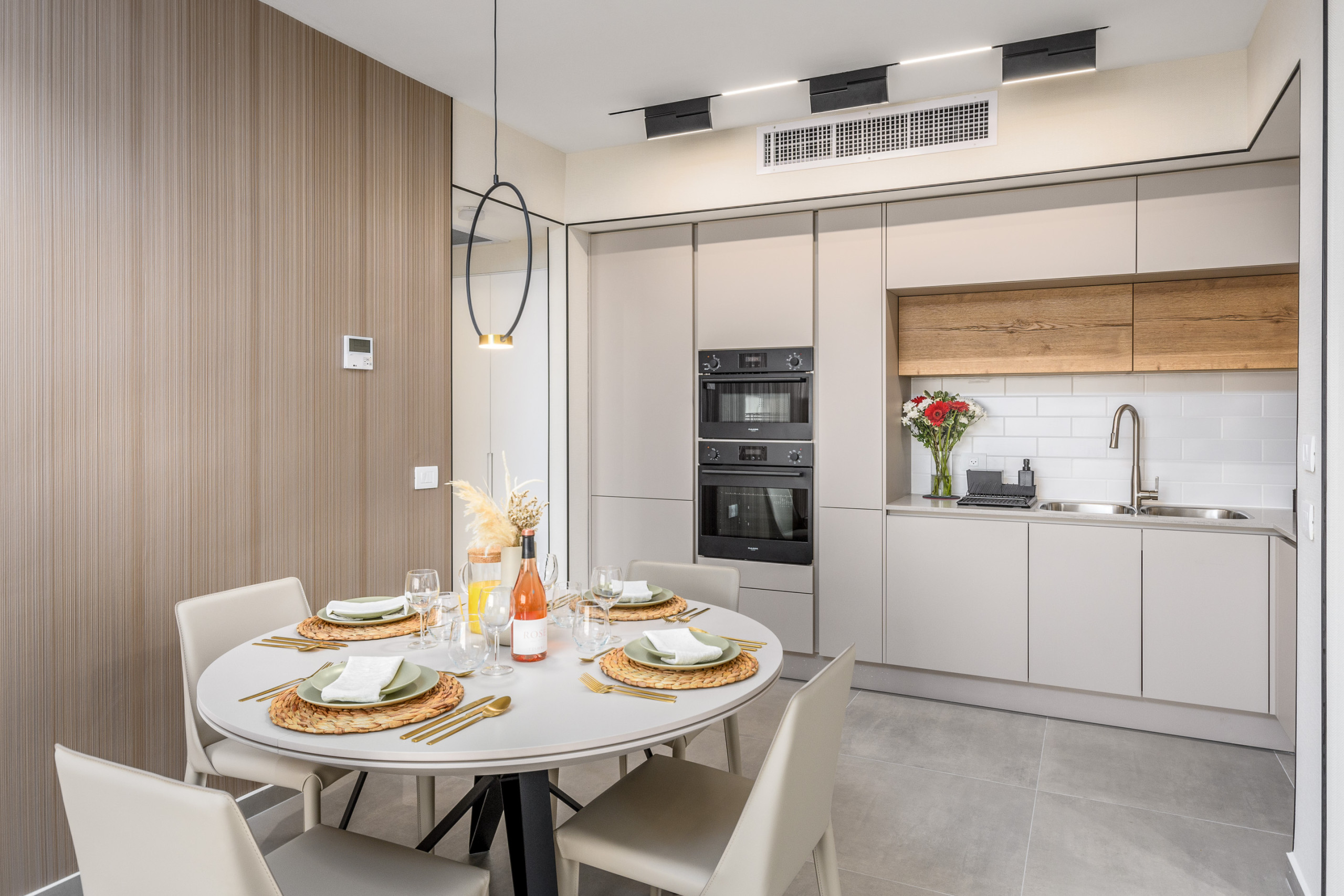La cuisine entièrement équipée comprend des appareils haut de gamme tels qu'un four, un réfrigérateur, un lave-vaisselle et tout ce qui est nécessaire pour un séjour confortable. L'appartement dispose également du Wi-Fi haut débit, d'une Smart TV, de la climatisation centrale et d'un éclairage moderne.