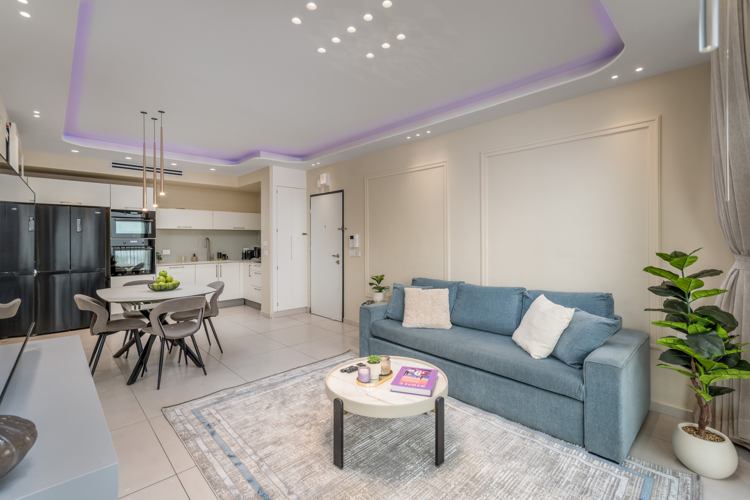 The fully equipped kitchen includes top-of-the-line appliances such as an oven, refrigerator, dishwasher, and everything needed for a comfortable stay. The apartment also features high-speed Wi-Fi, a Smart TV, central air conditioning, and modern lighting.