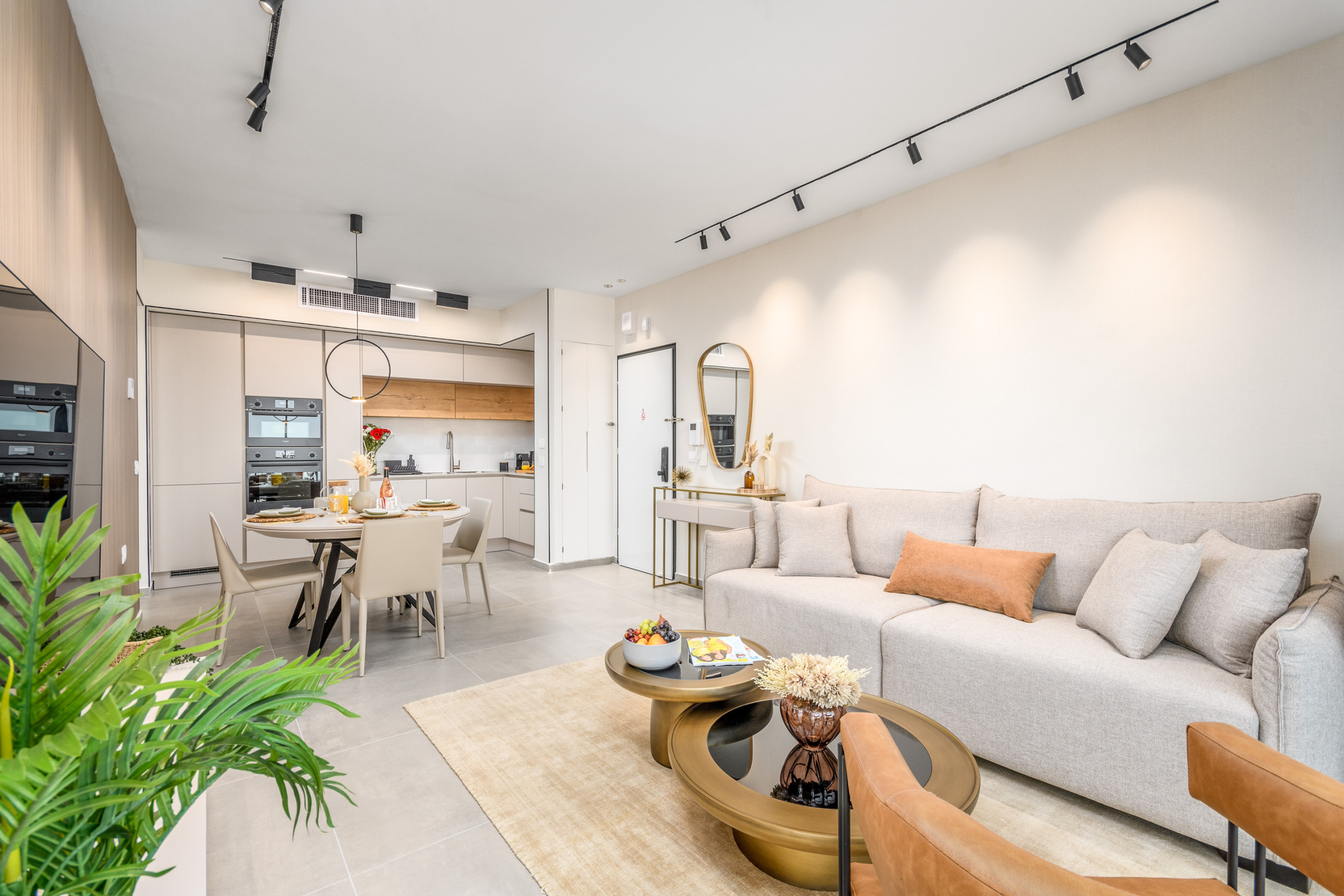 The fully equipped kitchen includes top-of-the-line appliances such as an oven, refrigerator, dishwasher, and everything needed for a comfortable stay. The apartment also features high-speed Wi-Fi, a Smart TV, central air conditioning, and modern lighting.